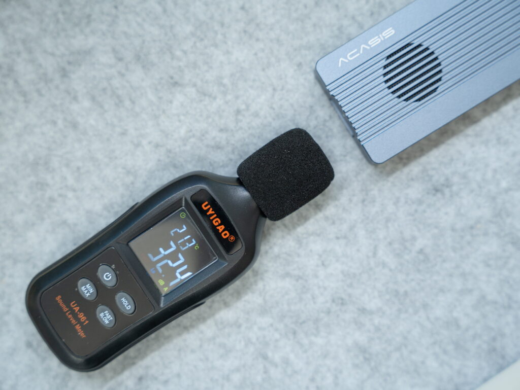 I also tested the cooling fan noise. When measuring with a decibel meter placed directly against the case, it registered 32.4 dBA; however, in a real-world usage environment, it sounds much quieter. It is incredibly quiet—you would need to press your ear right up against the case to hear even a faint fan noise.