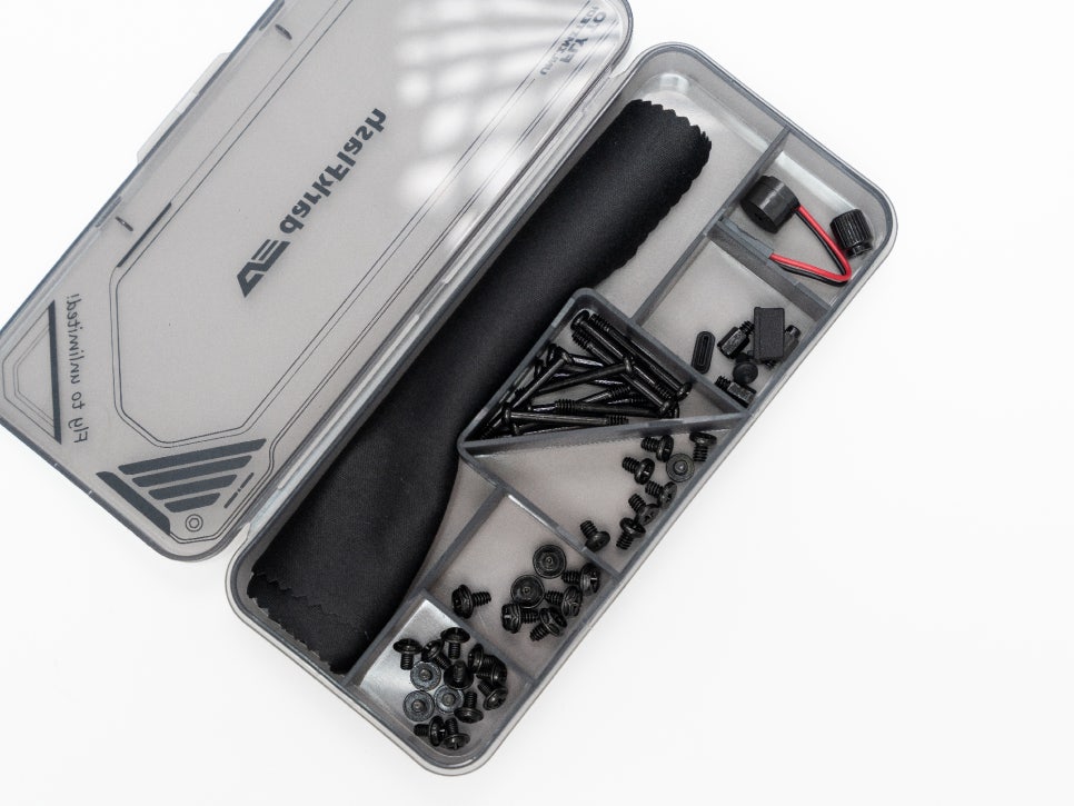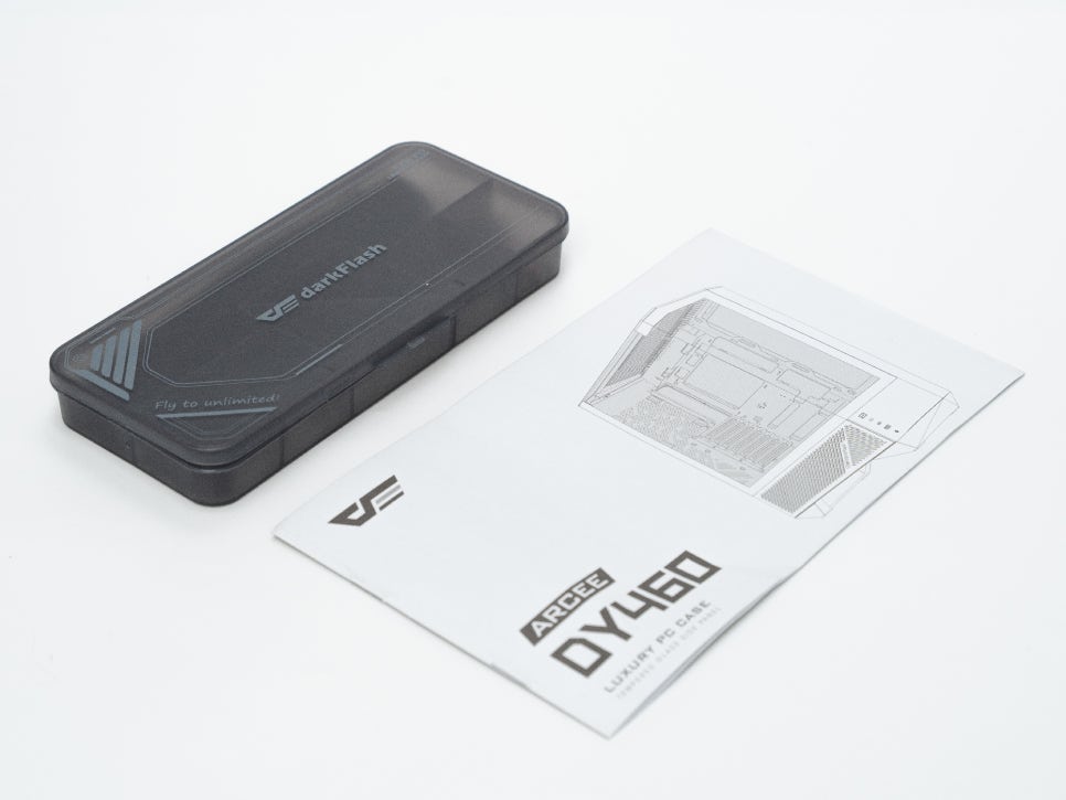Looking at the components, the case body and four DM12 PRO 120 PWM ARGB cooling fans are provided as standard. Additionally, a neatly organized utility box containing various screws and cable ties necessary for assembly is included, making assembly very convenient.