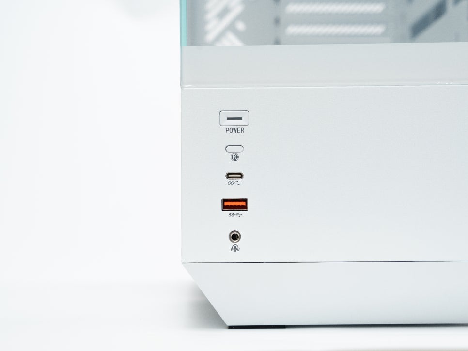 For users who place the main unit on their desk, the I/O ports are conveniently located at the bottom of the front panel. These include a power button, a reset button, one USB Type-C port, one USB 3.0 port, and an audio combo jack.