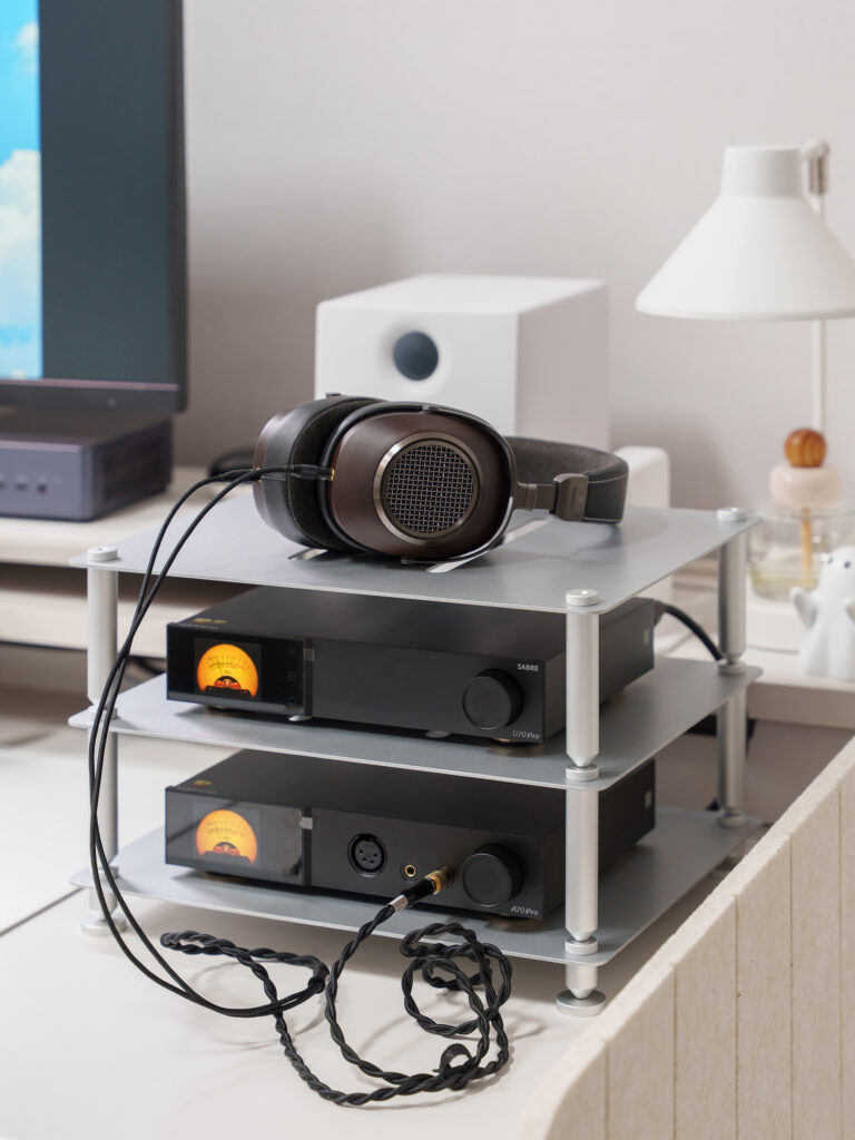 I myself, for music listening and gaming product reviews, brought in the Topping D70 Pro and A70 Pro. Wanting to organize them neatly, I purchased a shelf for set-top boxes from AliExpress and even added a cooling fan. However, even with a low-noise fan, the fan noise could be distracting in a quiet environment, and honestly, I wasn’t satisfied with the design.