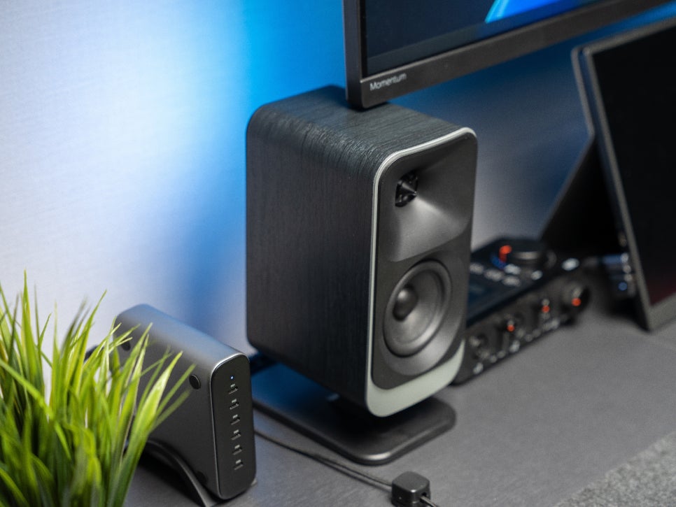 The profound black finish particularly complements a black desk setup. Rather than a metallic feel, it’s finished with a matte texture, allowing it to naturally harmonize with other peripherals like monitors, keyboards, and mice. The overall design is quite luxurious, making it feel less like just a speaker and more like an interior decor item.