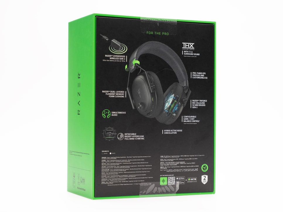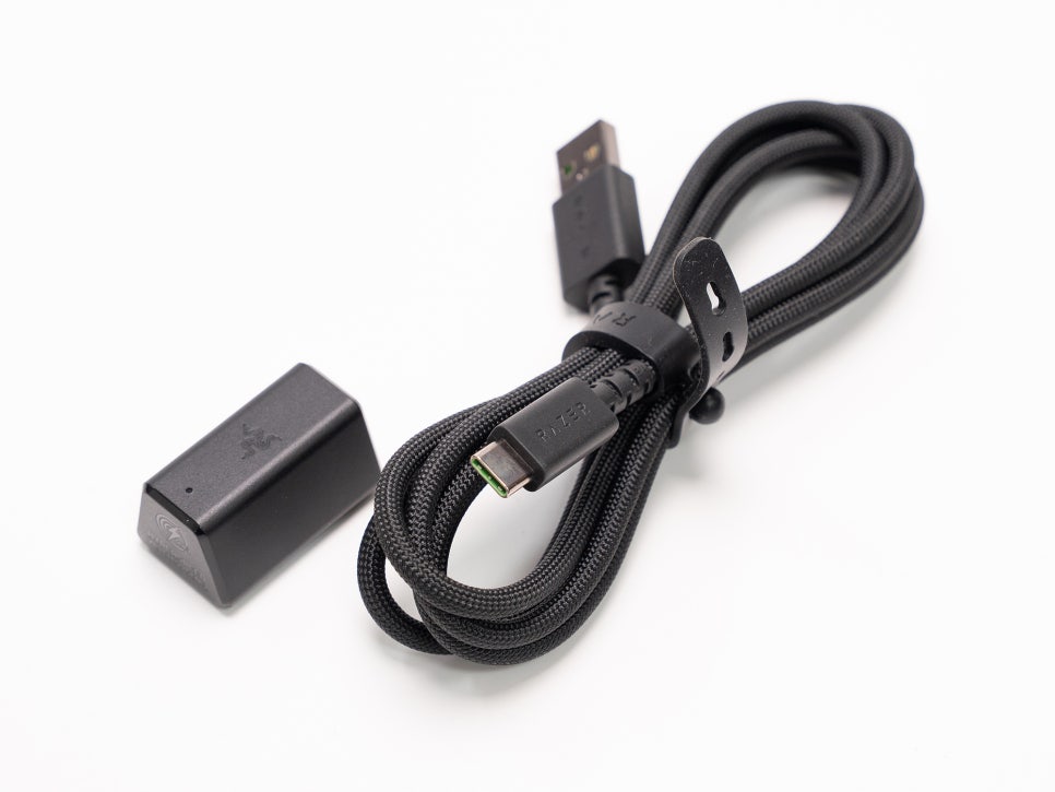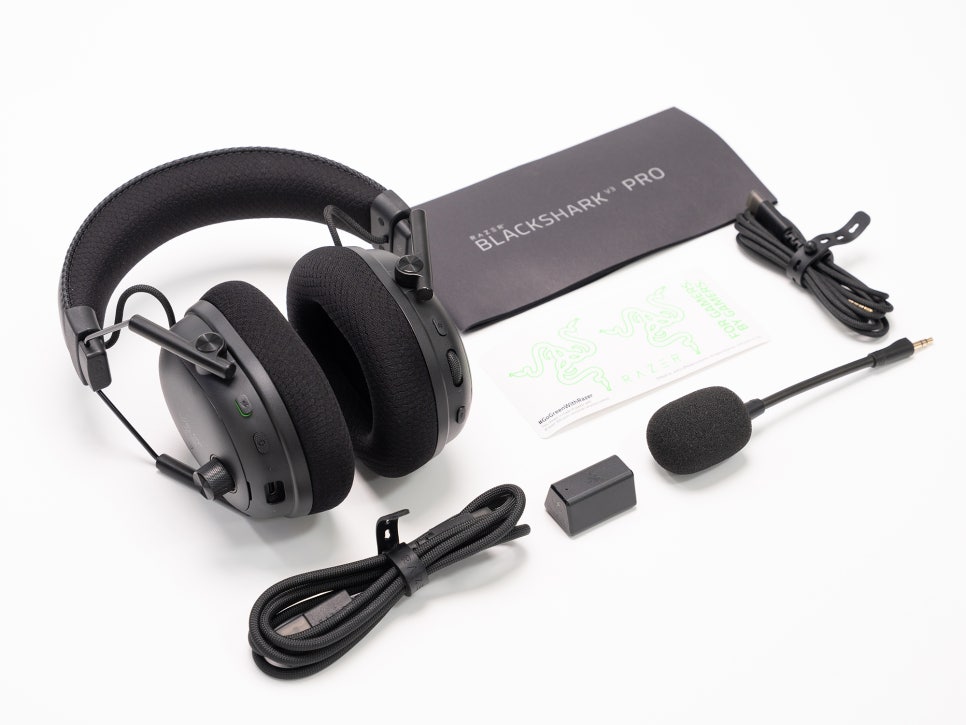 Looking at the contents, inside the box, you’ll find the BlackShark V3 Pro headset itself, the Razer HyperSpeed 2nd Gen wireless dongle, a detachable microphone, a USB-C charging cable, and a 3.5mm audio cable. The USB-C cable is a durable braided type, approximately 1.5m long, and thanks to the included 3.5mm cable, you can switch to a wired connection immediately if the battery runs out.