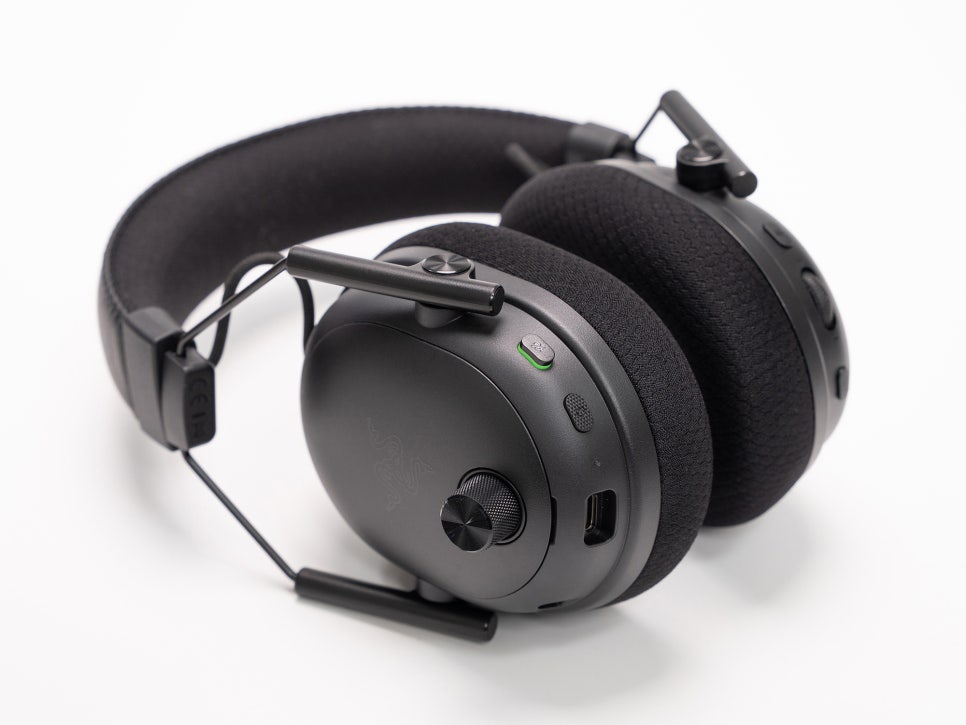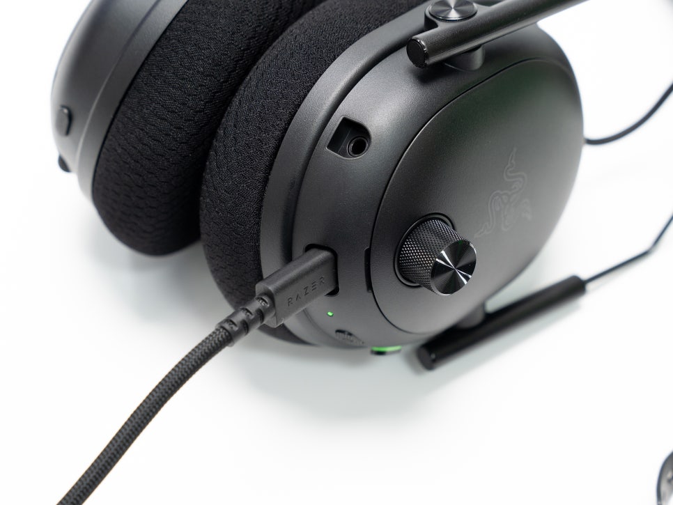 Looking at the left earcup of the headset, a textured volume knob is located at the top. This knob provides clear tactile steps when turned with a fingertip, which is great for intuitively adjusting the volume even during gaming. Below it, you’ll find a detachable microphone port, a mute button, a power button, and a USB-C charging port. The layout, with main controls concentrated on the left, is similar to its predecessor, but the button arrangement feels more streamlined.