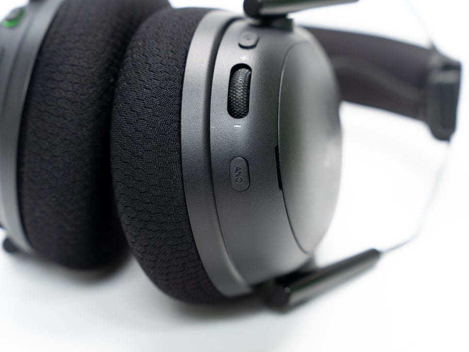 On the right earcup, the profile button allows you to switch between Bluetooth, HyperSpeed, and simultaneous output modes with a double-tap. The ANC button cycles through three modes: full noise cancellation, ambient (external sound passthrough), and OFF. The most noticeable feature is the multi-function roller. This roller can be used to adjust game/chat balance, microphone sidetone level, and even Razer’s newly added footstep volume scaling feature.