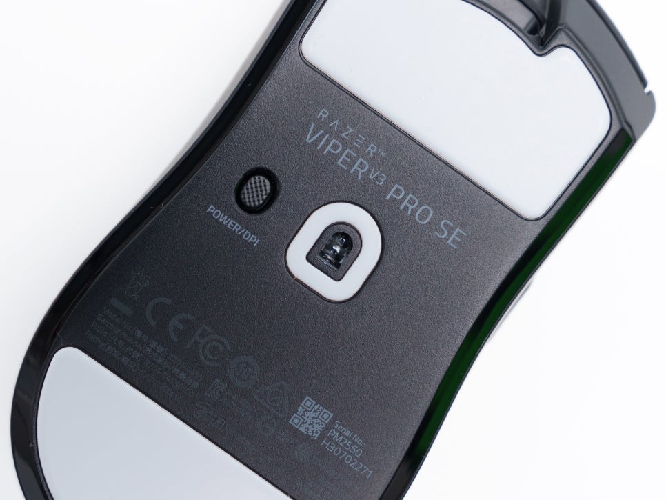 The bottom features power and DPI change buttons, and notably, the mouse feet are quite large. Unlike previous models, they now cover almost half the area, which significantly smoothed out movements, including sliding. Made from 100% PTFE material, these are the largest feet in Razer’s product line, offering an exceptionally smooth glide across mouse pads.