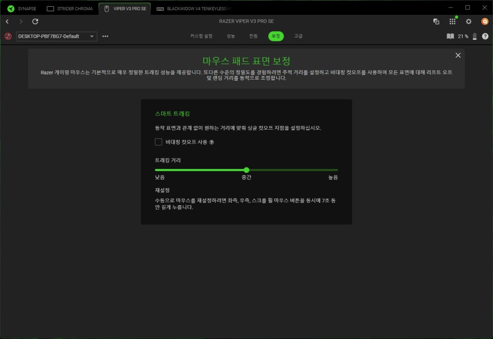 In the Calibration menu, you can set up Smart Tracking. This feature scans the surface of your mouse pad to provide optimal tracking performance. Sensor performance can vary slightly depending on the material of the mouse pad, but Smart Tracking ensures you can achieve the best performance on any pad.